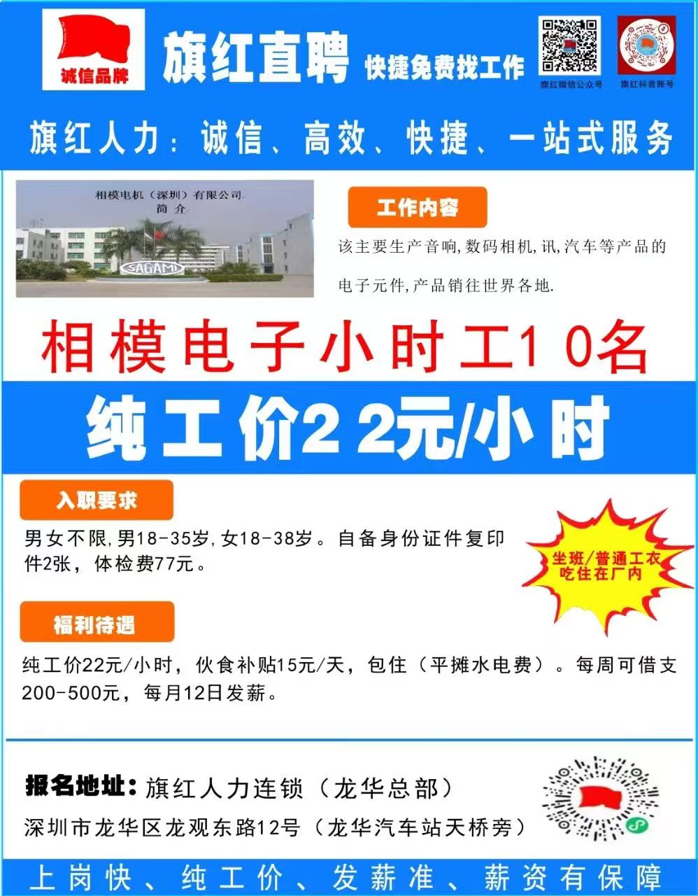 集合地点:深圳市龙华区龙华街道玉翠社区龙观路12号桦浩泰工业区A栋望城路16-2号(龙华汽车站门口天桥旁) 旗红人力连锁